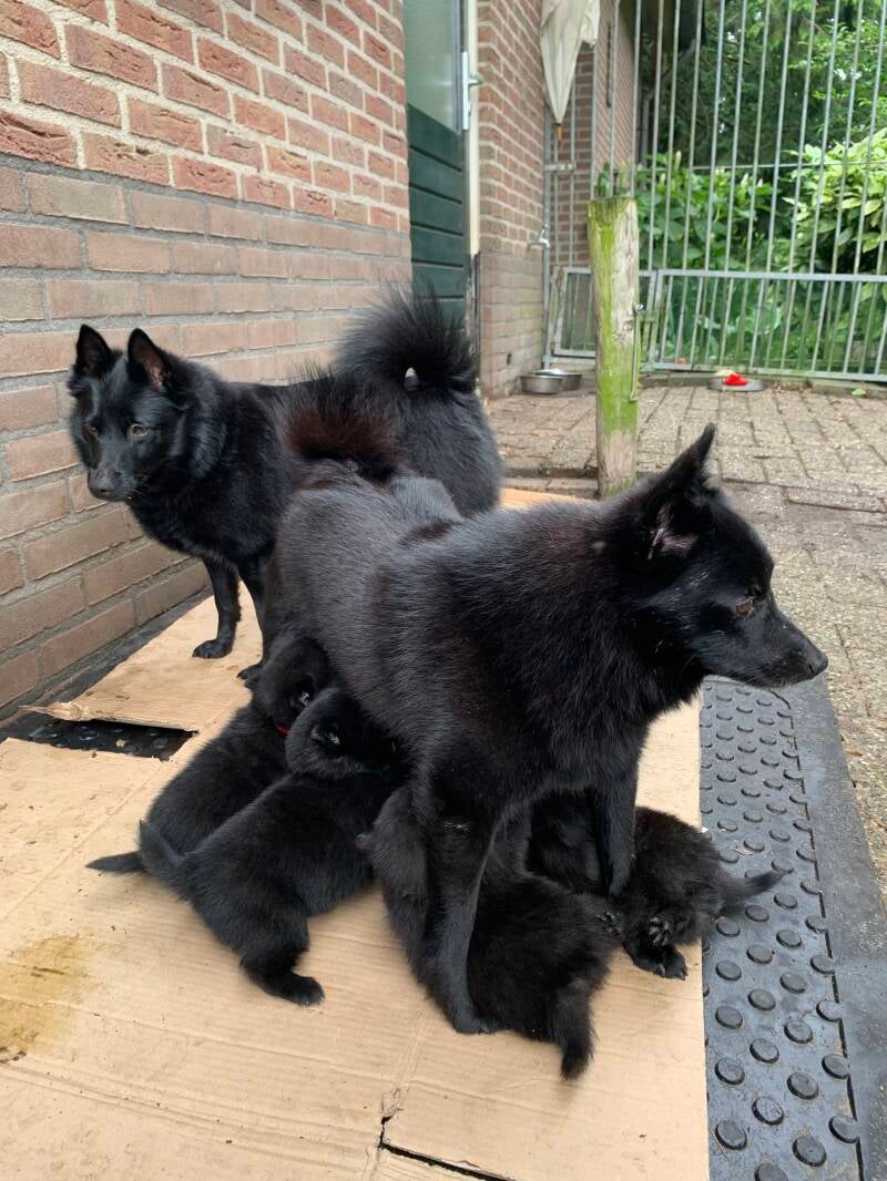 Soms piept er eentje, dat betekent dat het moet plassen want dat moet mamma hond voor ze regelen. Ze likt de buikjes en billetjes om dit te laten gebeuren.