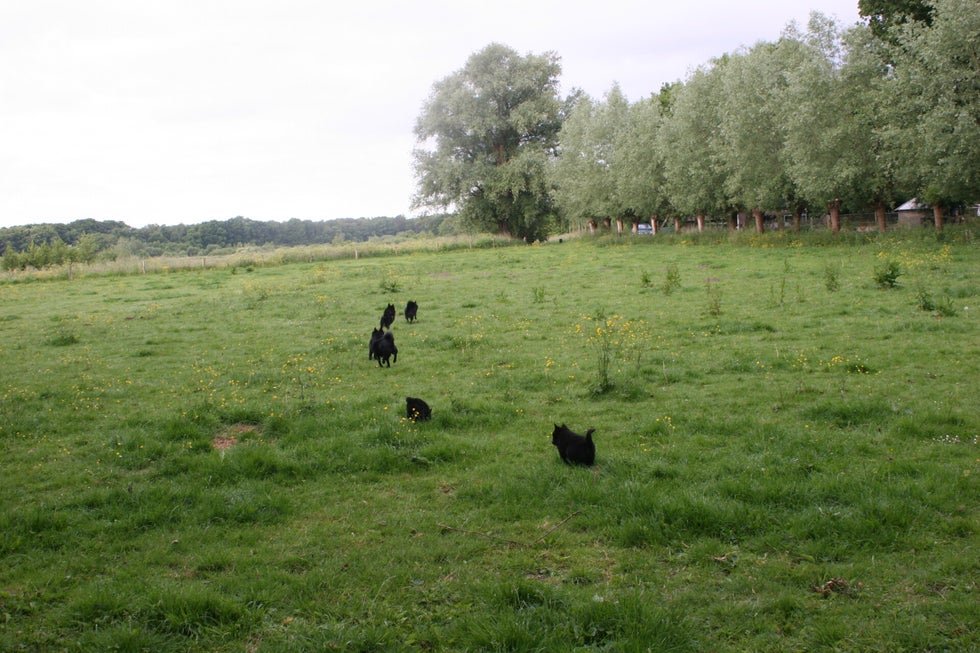 Ik had vorige week het drietal meegenomen op de ochtend wandeling met de volwassen Schipperkes. Het was groot feest, rennen stoeien, met de groten mee proberen te rennen dwars over de wei van het vlakke koe pad af waar ik op liep. Natuurlijk werden de hondjes echt hondsmoe hiervan. Dus na een poosje eiste Midas gedragen te worden. Hij dwong mij gewoon door steeds voor mijn voeten te lopen en mij in de benen te bijten. Daarna wilde Merlo ook niet meer lopen en meldde zich bij mij. Zo liep ik met onder iedere arm een puppy een stuk over het koe pad richting huis, Midas kon nog niet geen genoeg krijgen van alle uitbundige pret, hij probeerde Aroufke achterna te hollen om midden in de weide een molshoop te inspecteren.