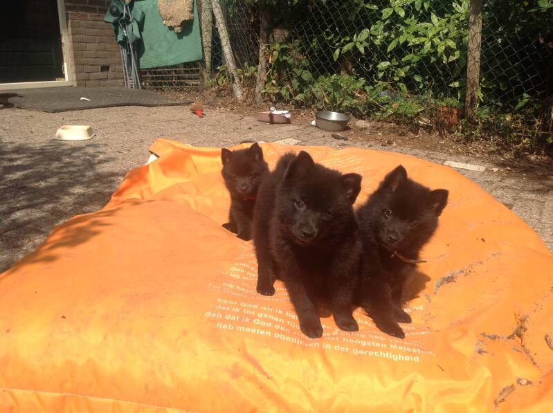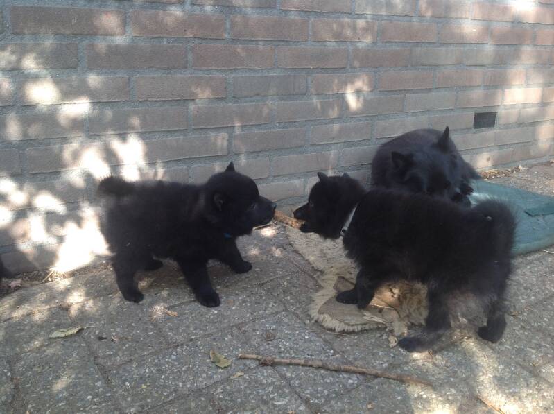 Als de hondjes ongeveer vijf weken oud zijn gaan ze steeds eventjes buiten spelen.